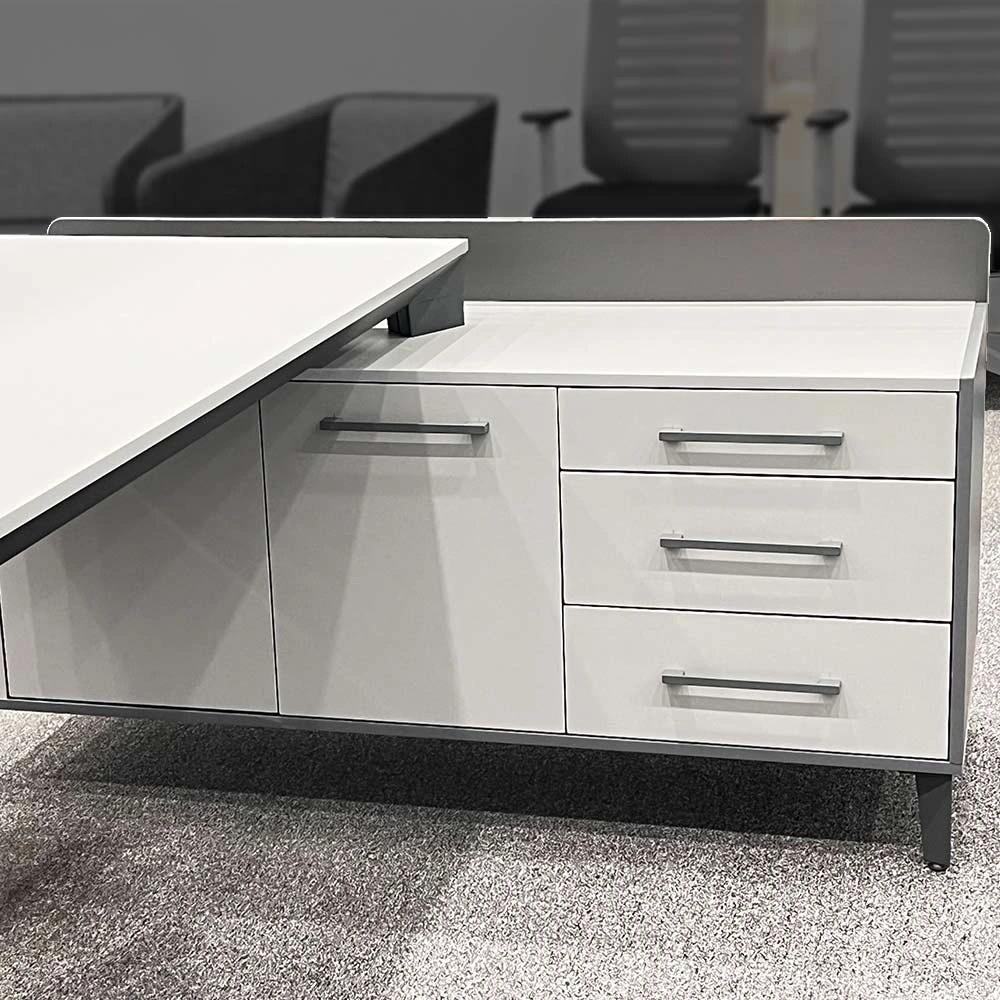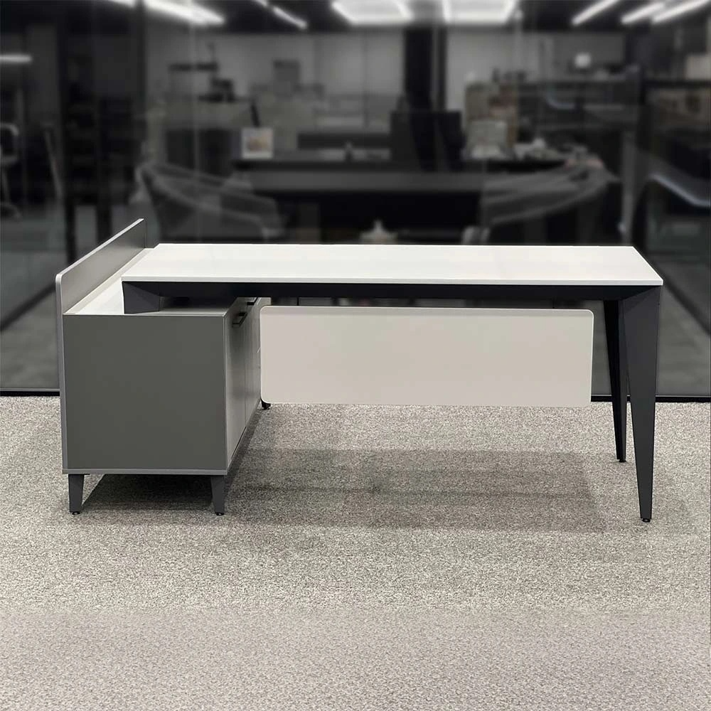 The Rima executive desk is a modern, ergonomic, L-shaped office desk designed with high-quality MDF material and uniquely styled metal legs for managerial offices. This desk features an advanced filing section with three drawers and two cabinet doors to meet managers’ document organization needs. Fotros Design Process offers the Rima desk with customizable options in color and dimensions, as well as the choice of including or excluding a divider in the filing section. Below, we review the features, benefits, and specifications of this product to help make a smart choice when purchasing an L-shaped office desk.